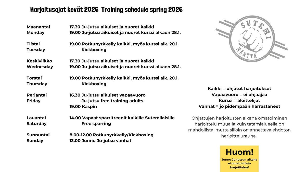 Täällä näet ajantasaiset harjoitusaikataulut eri lajeille. Jos olet kokenut harjoittelija ja haluat mukaan toimintaan, laita meille viestiä yhteystieto-välilehden kautta, niin sovitaan aloittamisestasi.